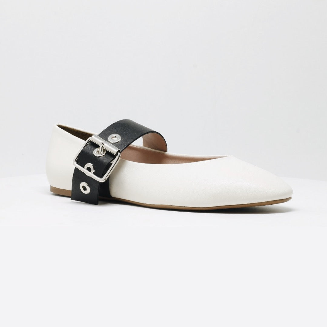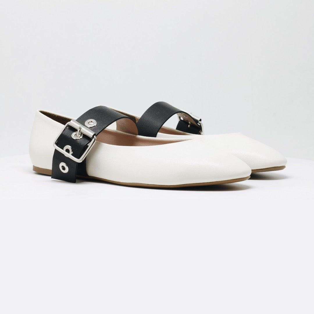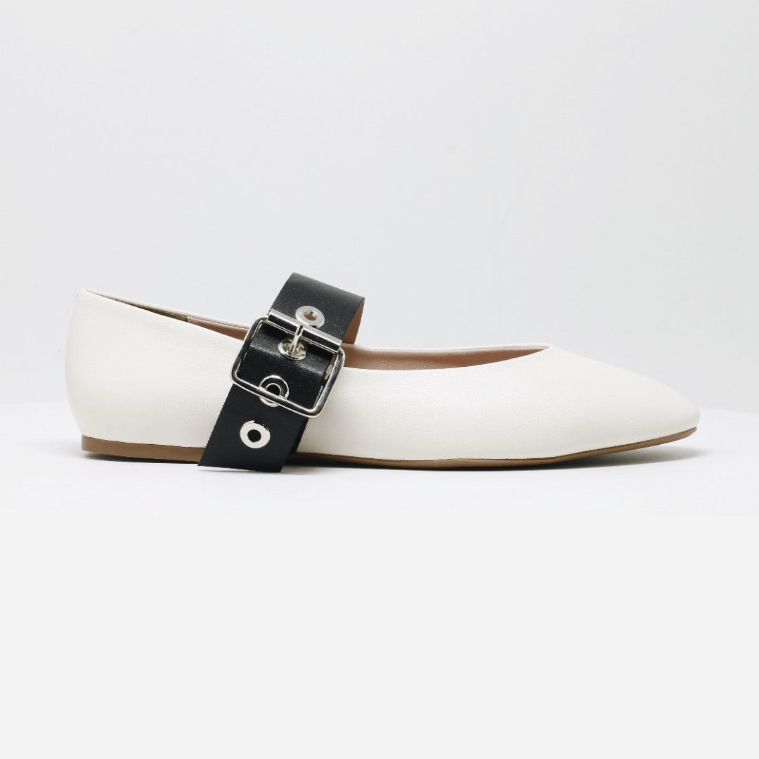 Un clásico con actitud. Estas flats en tono blanco latte con punta afilada y una correa negra XL con hebilla metálica son la definición de sweet but edgy. Perfectas para elevar tus looks del día a día sin perder comodidad (ni estilo). Llévalas con jeans, mini falda o ese vestido que amas repetir. Because comfort can be bold too.